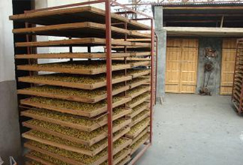 1、階段,升溫階段:將裝好菊花的托盤,平整的放入烘箱,不能重疊,避免托盤放置不好造成不必要的漏風。關閉箱門打開熱風爐風機,點燃熱風爐,開始向箱內送熱風,逐漸將箱內溫度加熱至50°,加熱30分鐘~1.5小時,看箱內有濕氣時,開始排潮,大約排潮2分鐘左右,排潮后箱內溫度會有所下降,繼續供熱。