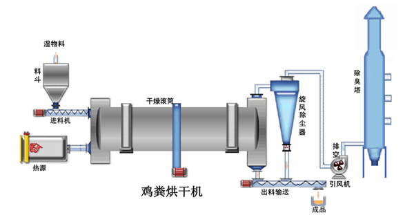 根據(jù)熱功原理,筒內(nèi)裝有不同角度和間距的揚(yáng)料板和導(dǎo)料板,這種結(jié)構(gòu)能夠保證被烘干物料在重力作用下沿著螺旋的運(yùn)動(dòng)方向運(yùn)動(dòng),在筒內(nèi)保持足夠的停留時(shí)間和充分的分散度,致使物料在筒內(nèi)與來自燃燒室內(nèi)的熱氣流進(jìn)行充分的熱交換,消除了常規(guī)烘干設(shè)備截面常出現(xiàn)風(fēng)洞而引起的熱交換面積小、單位容積蒸發(fā)強(qiáng)度低的缺陷。